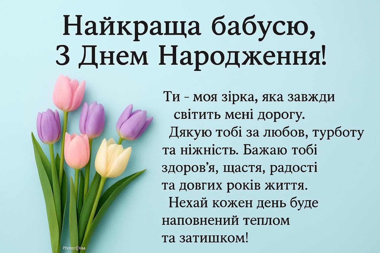 - Дорога бабуся! Вітаю тебе з днем народження! Бажаю тобі міцного здоров’я, гарного настрою, сили духу і завжди залишатися юною душею. Спасибі тобі за твою любов, турботу і мудрі поради. Нехай кожен рік буде наповнений радістю, щастям і гармонією. Радуй нас своєю посмішкою кожен день ще дуже багато років.
