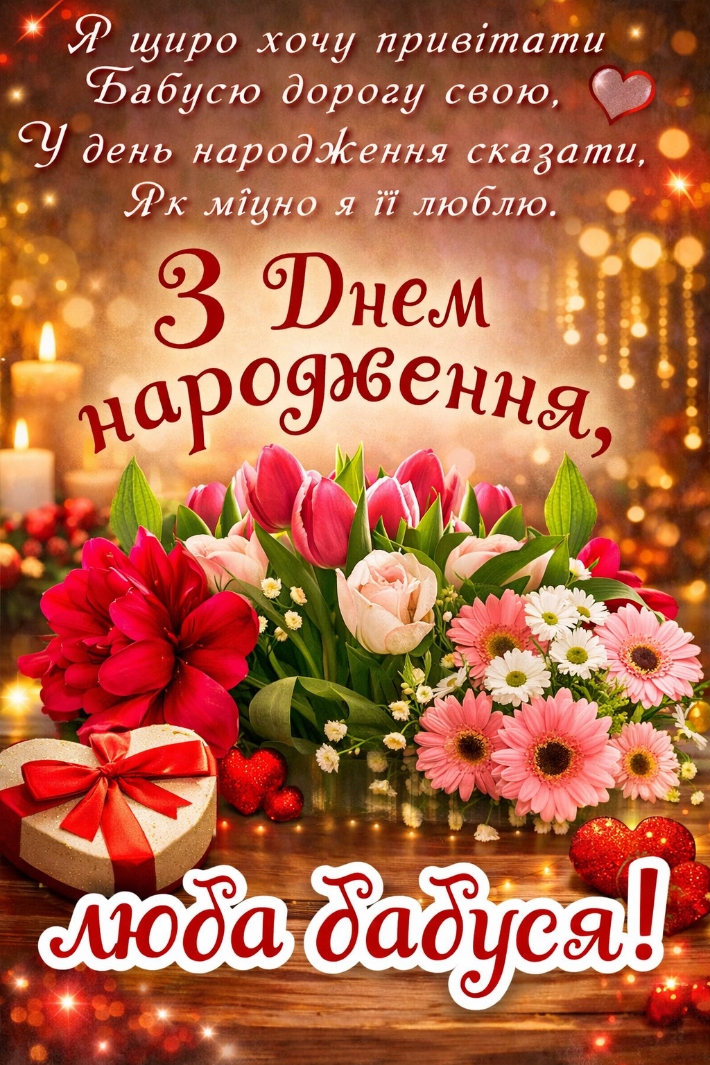 - Улюблена моя бабуся! Вітаю тебе з днем народження. Бажаю тобі міцного здоров’я та довгих років життя. Нехай кожен новий день буде сповнений любов’ю, турботою та щастям. Радуй нас своєю присутністю, прекрасною усмішкою. Ти наш безцінний скарб!