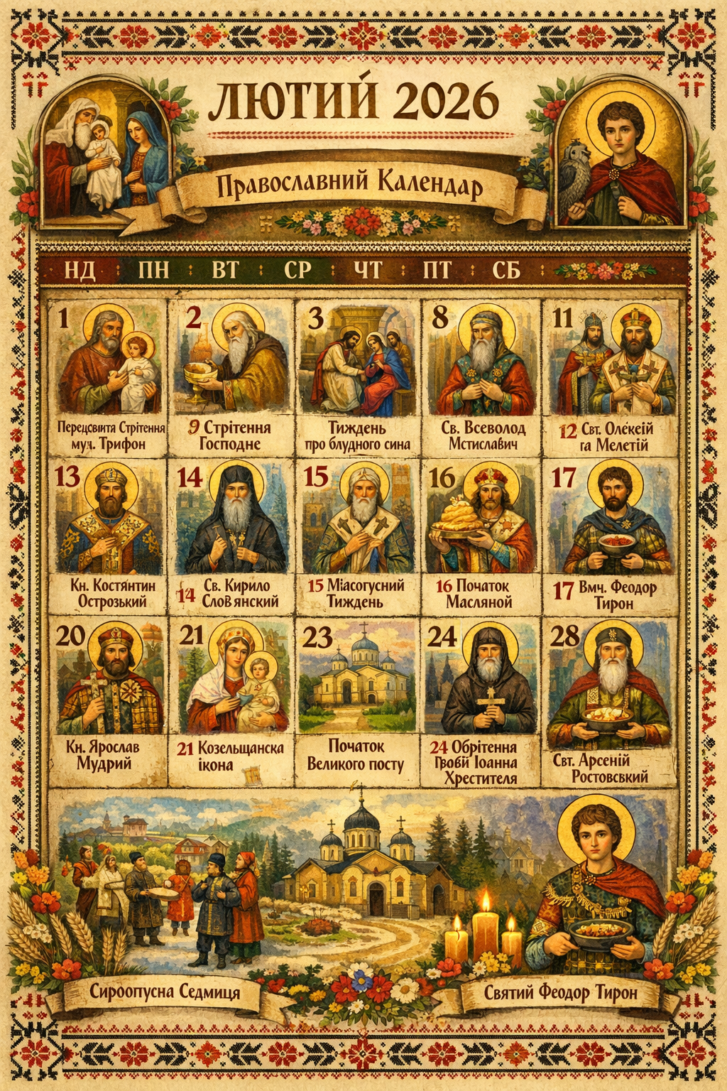 Ось найважливіші дати лютого 2026 року за новим стилем (ПЦУ, УГКЦ):