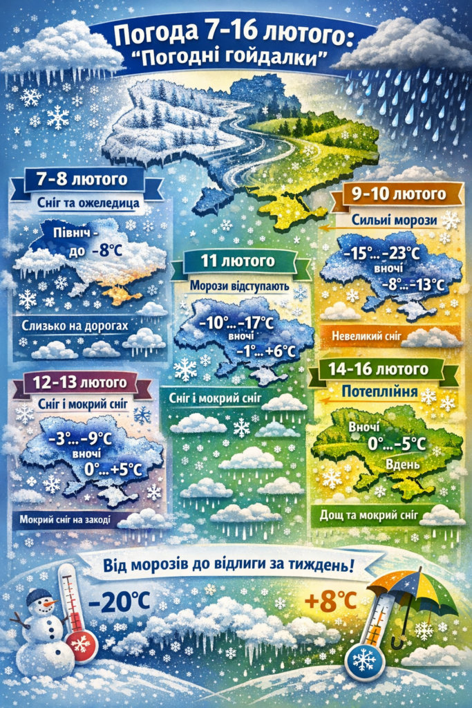 7-8 лютого — перехідний період під впливом циклону. Очікуються опади різної фази: сніг на півночі, сніг із дощем на решті території. У центральних та східних областях формується новий шар ожеледиці, на дорогах — слизько. Місцями тумани на Прикарпатті, Закарпатті, півдні та сході. Температура вночі 7 лютого: -1…-8°C на півночі, вдень — від -4 до +4°C. 8 лютого вночі вже -5…-10°C, вдень від -4 до +4°C, на Закарпатті та в Криму до +4…+11°C.