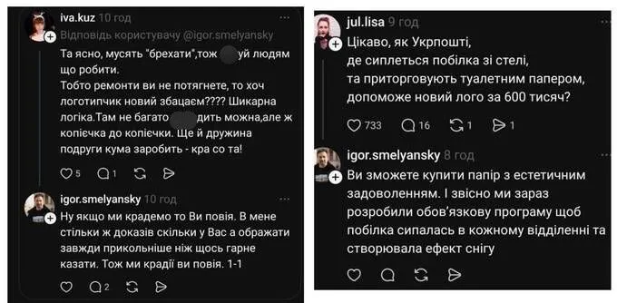Ігор Смілянський опублікував у Threads допис про негативну реакцію аудиторії на ребрендинг Укрпошти за 600 тисяч гривень. Під постом користувачка iva_kuz (Іванна) розкритикувала витрати: за її словами, нова айдентика виглядає недоречно, коли більшість поштових відділень перебувають у занедбаному стані — приміщення схожі на хліви, а глибокі сенси не компенсують реального вигляду. Вона також натякнула на можливі корупційні схеми при розподілі коштів.