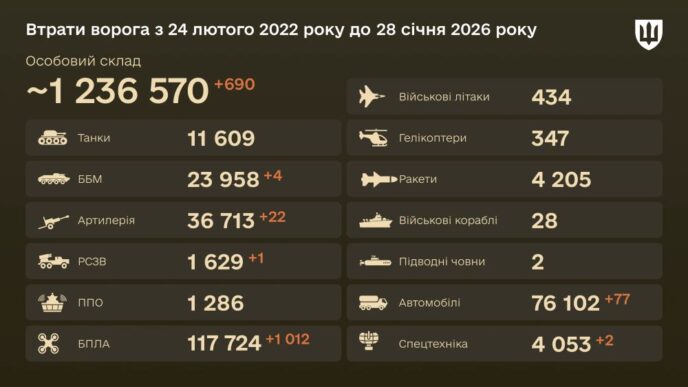Загальні бойові втрати ворога на 28 січня 2026 року – зведення Генштабу