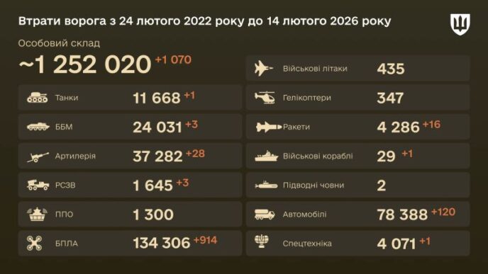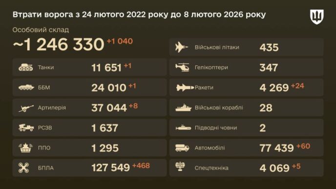 Росія втратила понад 1,24 млн солдатів: оновлені цифри ЗСУ на 6 лютого 2026