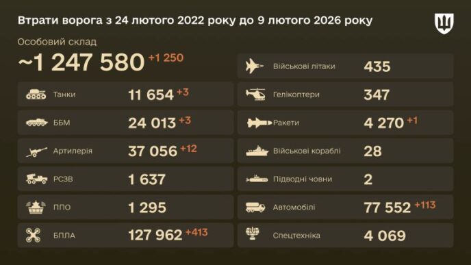 Загальні бойові втрати ворога на 9 лютого 2026 року