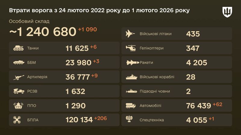 Головне: ЗСУ продовжують завдавати суттєвих втрат російським окупаційним військам. Станом на 1 лютого 2026 року загальні бойові втрати РФ сягнули близько 1,24 млн осіб особового складу, а також десятків тисяч одиниць техніки, включно з рекордними показниками по БПЛА та артилерії. За останню добу (31 січня) ворог втратив понад 1 тисячу солдатів і значну кількість дронів та артилерійських систем. 1 лютого 2026