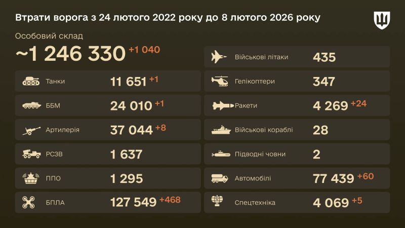 Головне: За даними Генштабу ЗСУ, станом на 8 лютого 2026 року загальні втрати російських військ з початку повномасштабного вторгнення перевищили 1,246 млн осіб особового складу, а також значну кількість техніки, авіації, дронів та ракет. Лише за попередню добу агресор втратив близько 1040 солдатів, 468 БПЛА та інше озброєння. 8 лютого 2026