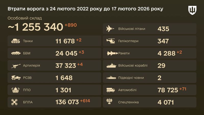 З початку повномасштабного вторгнення 24 лютого 2022 року по 17 лютого 2026 року загальні бойові втрати російської армії в особовому складі сягнули близько 1 255 340 осіб. Лише за останню добу цей показник зріс на 890 військових, що підтверджує продовження активної фази бойових дій і високу ефективність українських захисників у знищенні живої сили противника.