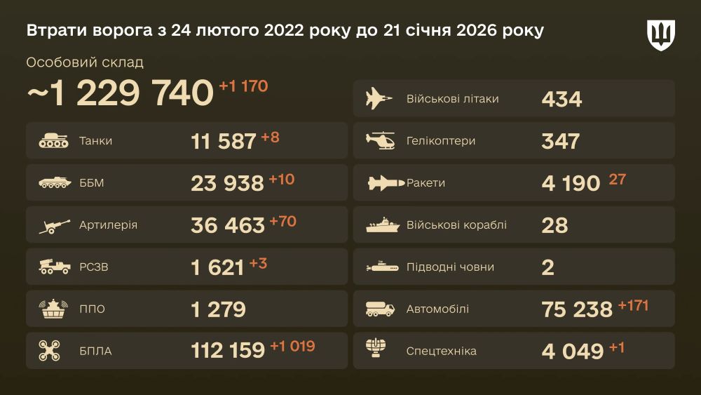 Сукупні втрати особового складу російських окупаційних військ з 24 лютого 2022 року по 21 січня 2026 року оцінюються приблизно в 1 229 740 осіб. Це свідчить про колосальні демографічні та військові наслідки для країни-агресора після майже чотирьох років війни.