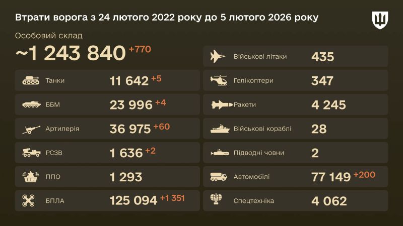 За весь період повномасштабного вторгнення з 24 лютого 2022 року по 5 лютого 2026 року російські війська втратили приблизно 1 243 840 осіб особового складу.