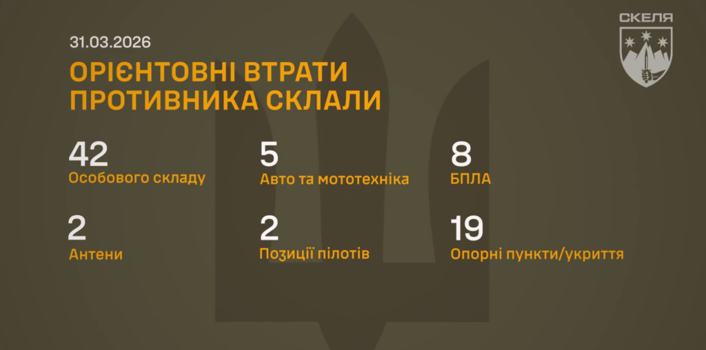 Результати роботи полку «Скеля» за 31 березня 2026 року вражають своєю масштабністю. Завдяки професійним діям підрозділу було ліквідовано:
