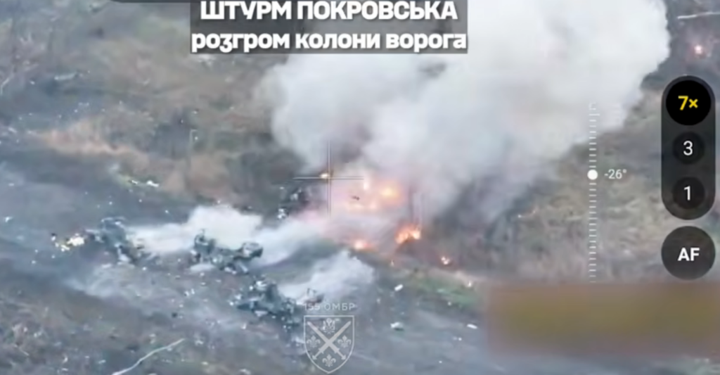 [00:01 – 01:45] На сьогодні основна перевага російських окупантів полягає виключно у великій кількості живої сили, оскільки командуванню РФ «байдуже на своїх людей». Через значні втрати техніки ворог змушений використовувати нетиповий транспорт: окупанти намагаються доїхати до Покровська на маршрутках, а іноді готові використовувати навіть віслюків. Тактика противника полягає у «просочуванні» малими піхотними групами, які вклинюються в українські порядки та чекають підкріплення.