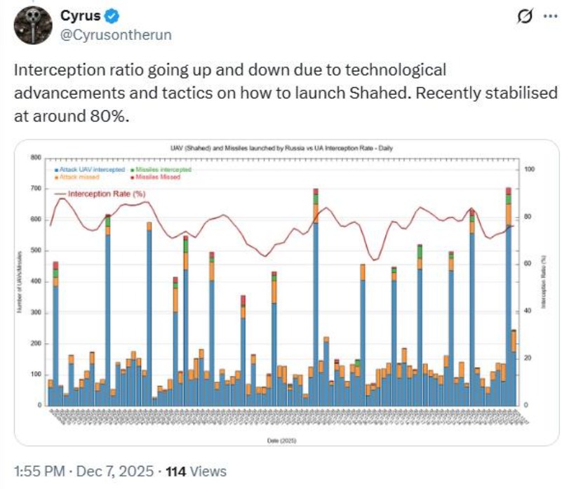 За даними військових, ефективність української ППО залишається високою, але з урахуванням масштабів атак противника окремі дрони досягають цілей або падають у житлових районах. Це зумовлено як кількістю запущених Shahed, так і застосуванням Росією тактики перевантаження систем ППО.