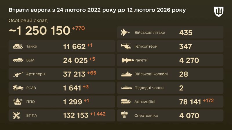 За весь період повномасштабної війни з 24 лютого 2022 року по 12 лютого 2026 року армія РФ втратила близько 1 250 150 військовослужбовців. Лише за останню добу цей показник зріс на 770 осіб, що підтверджує інтенсивність бойових дій на ключових напрямках фронту.