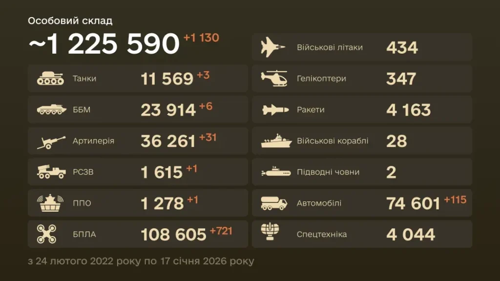 Головне: За даними Генштабу ЗСУ, станом на 17 січня 2026 року загальні втрати російських військ з початку повномасштабного вторгнення перевищили 1,225 млн осіб, з істотним добовим приростом у БПЛА (+721), артилерії (+31) та особовому складі (+1130). 17 січня 2026 року.
