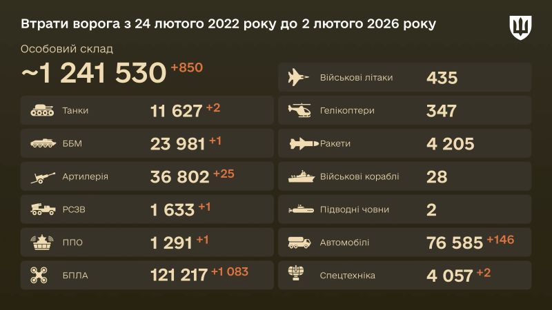 Головне: Згідно з даними Генштабу ЗСУ, станом на 2 лютого 2026 року загальні втрати російських військ перевищили 1,24 млн осіб особового складу, а також значну кількість техніки, дронів та ракет. За добу 1 лютого ворог втратив близько 850 військових, понад тисячу БПЛА та 25 артсистем. Дані за 2 лютого 2026 року.