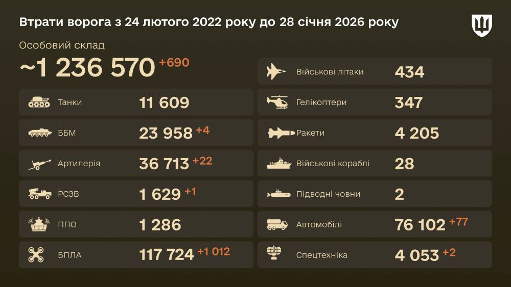 Головне: Знищено 690 окупантів, понад тисячу дронів та 22 артилерійські системи за добу; загальні втрати РФ перевищили 1,236 млн осіб особового складу станом на 28 січня 2026 року.